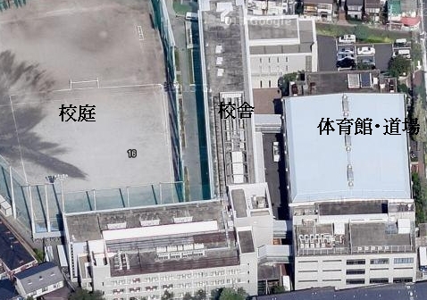 教室で授業を受けている生徒達です。世田谷学園の校舎は校庭と体育館に挟まれる形で建っています。